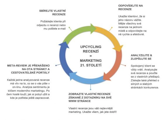 Upcycling neboli česky upcyklace se řadí k postmodernímu pojetí světa. V obecné rovině je upcycling směr, jehož cílem je přeměna starých a nepotřebných produktů na produkty s vyšší užitnou hodnotou, než jakou měl původní výrobek. Převedeno do jazyka on-line reputace – vezmeme původní text recenze, text pomocí analýzy sentimentu neboli přirozeného jazyka1) vyhodnotíme. To samé provedeme s dalšími získanými recenzemi v konkrétním ubytovacím zařízení. Z výstupní analýzy sentimentu pak vytvoříme nezávislý index, kterému firma TrustYou říká Meta-Review. Meta-Review je tedy česky řečeno shrnutí přirozené analýzy jazyka recenzí a hodnocení.